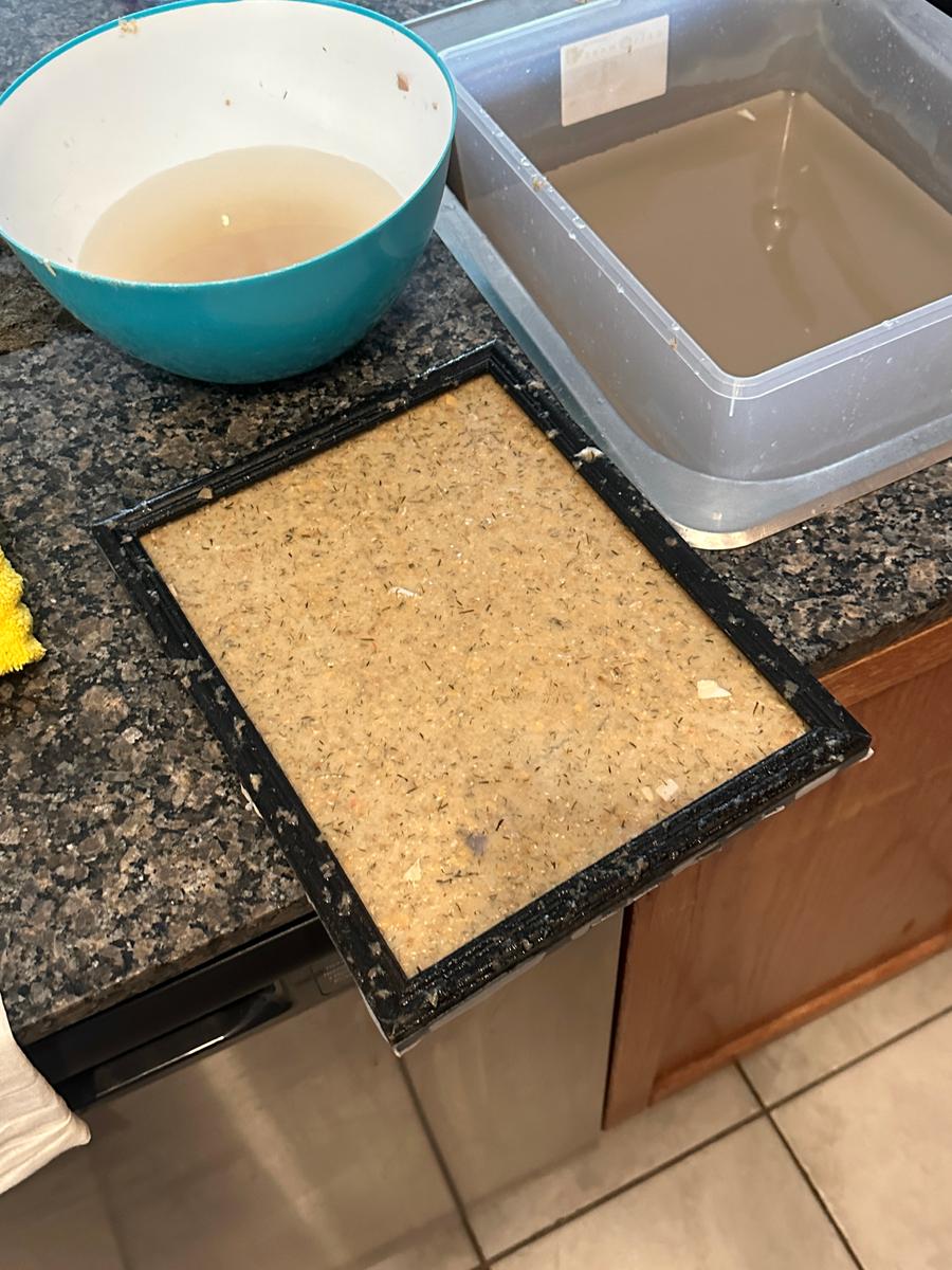 To make my mould and deckle, I simply followed the countless YouTube tutorials suggesting using old frames from Value Village, and stapling a screen to them. The finer the screen, the less imprint it will leave on the paper.
